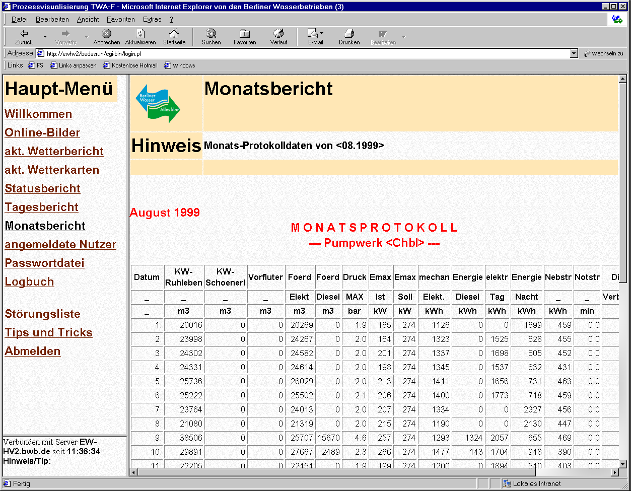 Aktuelle Berichte von verschiedenen Anlagen (z.B. Pumpwerke) in Tabellenform