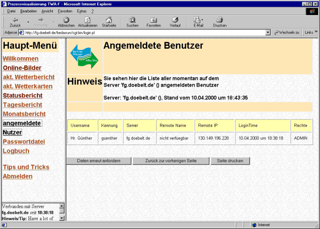 Aktuelle Übersicht über angemeldete Nutzer mit vielen Informationen, z.B. Rechte, Einlogzeit, Remote Adresse